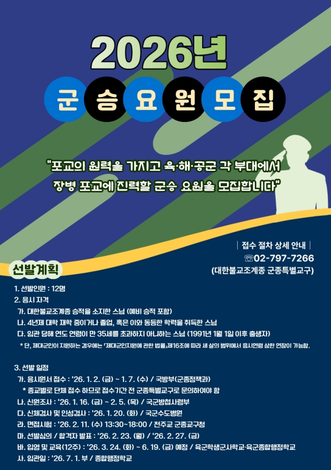 조계종 군종특별교구(교구장 법원스님)는 “국방부 2026년 군종장교(요원) 선발 계획에 따라 2026년 임관 군승을 모집한다”고 밝혔다. 군종교구는 2026년 임관할 군승을 12명 선발한다는 계획이다.
